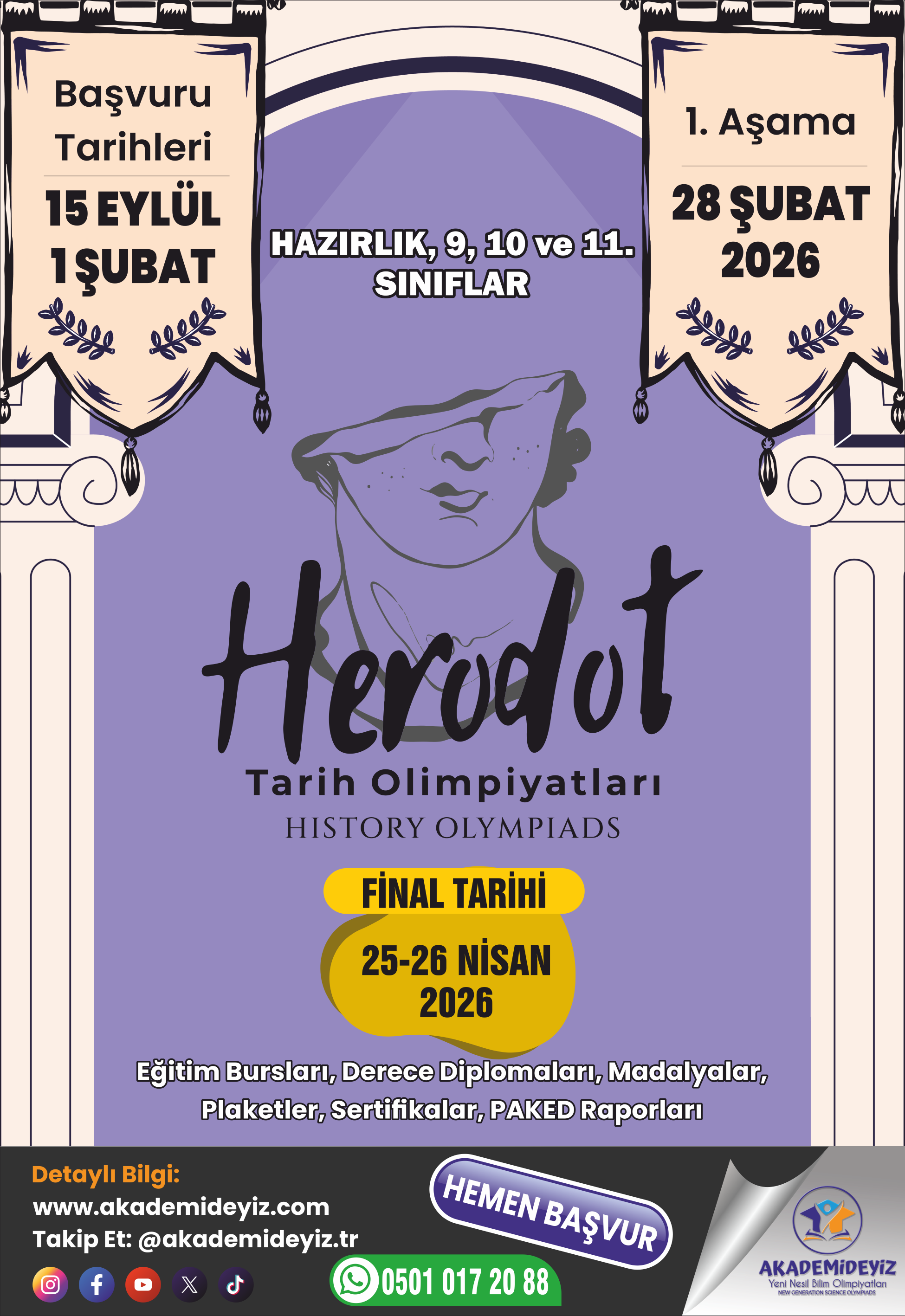 HERODOT TARİH OLİMPİYATLARI, öğrencilerimizin tarih bilgisini ölçmek, tarihî olayları anlama ve yorumlama yeteneklerini geliştirmek amacıyla düzenlenir. Bu olimpiyatlar, öğrencilerimizin tarihî olayları kronolojik olarak sıralama, neden-sonuç ilişkilerini anlama, farklı bakış açılarıyla tarihî olayları değerlendirme becerilerini geliştirmelerine olanak tanır. Ayrıca, öğrencilerin analitik düşünme, araştırma yapma ve belge kullanma yeteneklerini de geliştirir. Herodot Tarih Olimpiyatları, gençleri tarih bilimine ilgi duymaya teşvik eder ve tarihî olayların anlaşılmasını ve değerlendirilmesini sağlayarak kültürel anlayışı arttırmayı hedefler. 9,10 ve 11. SINIFLARDA OKUYAN ÖĞRENCİLERİMİZ YARIŞMALARA KATILABİLİR. Özel okullar, devlet okulları ve dershanelerde eğitim gören öğrenciler yarışmalara katılabilir.