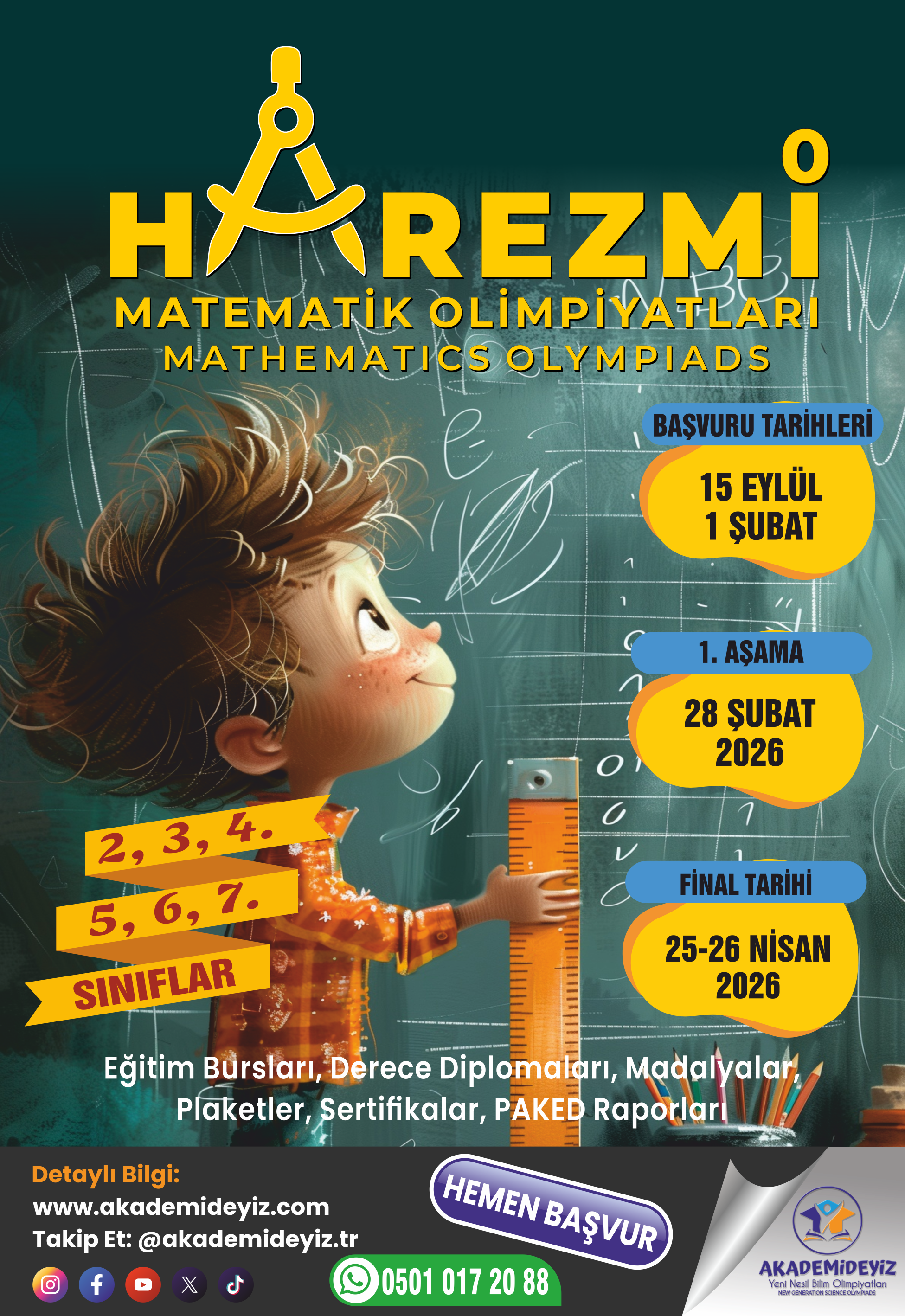 HAREZMİ MATEMATİK OLİMPİYATLARI, öğrencilerimizin problem çözme, mantık yürütme ve analatik düşünme becerilerini ölçmek için düzenlenen bir yarışmadır. HAREZMİ MATEMATİK OLİMPİYATLARI matematik, mantık bulmacaları ve bilgisayar bilimi gibi alanlarda zekayı ölçmeyi amaçlar. Bu yarışmalar, katılımcıların zihinsel yeteneklerini geliştirirken aynı zamanda kendilerini test etmelerine olanak tanır. İLKOKUL 2,3 VE 4. SINIFLAR, ORTAOKUL 5, 6 VE 7. SINIFLAR, HAZIRLIK, 9, 10 VE 11.SINIFLARDA OKUYAN ÖĞRENCİLERİMİZ YARIŞMALARA KATILABİLİR. Özel okullar, devlet okulları ve dershanelerde eğitim gören öğrenciler yarışmalara katılabilir.