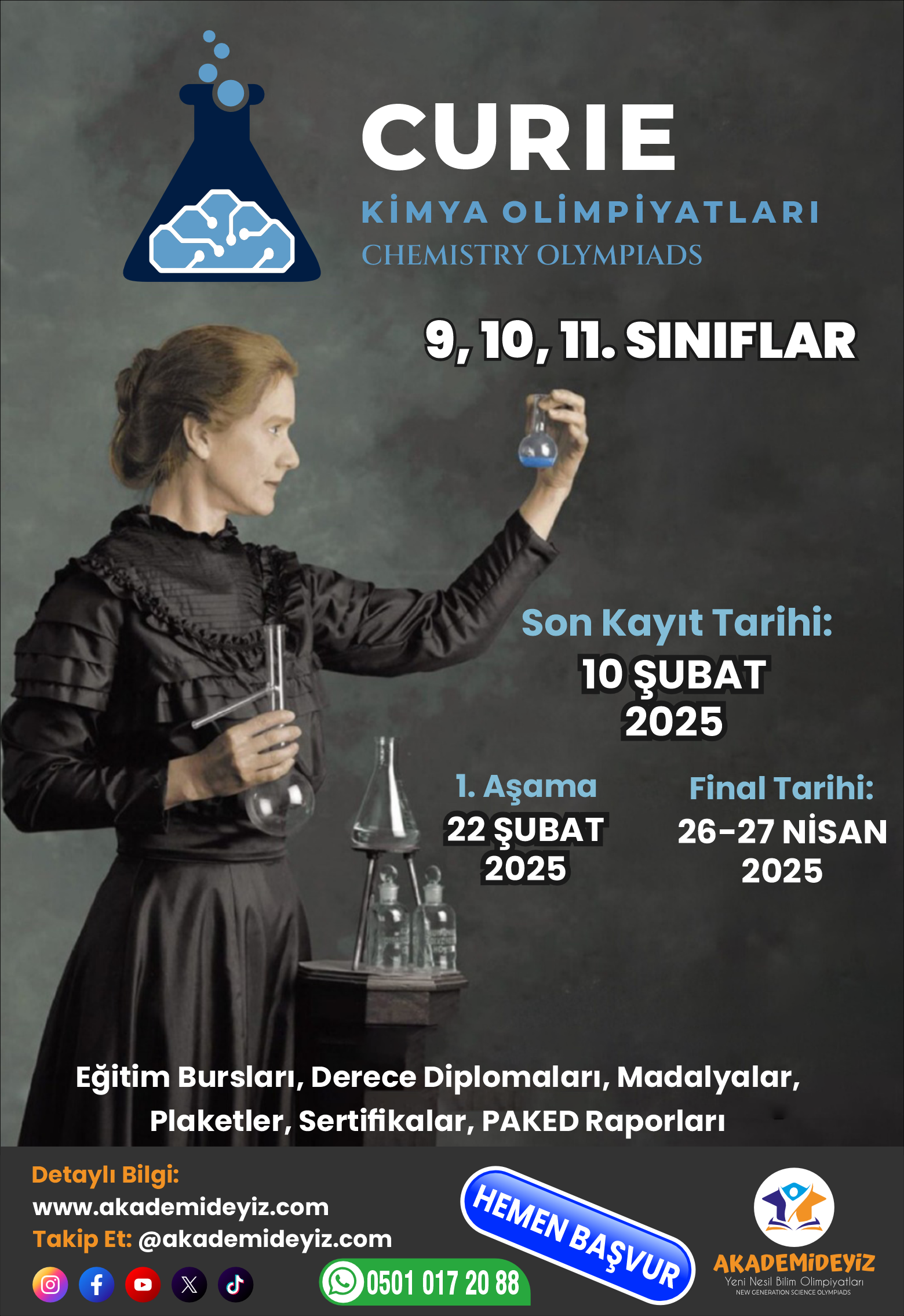 CURIE KİMYA OLİMPİYATLARI, kimya alanında öğrencilerin bilgi düzeylerini ölçmek, kimya becerilerini geliştirmek ve öğrencilere bilimsel düşünme ve problem çözme yetenekleri kazandırmak amacıyla düzenlenmektedir. Bu olimpiyatlar, katılımcıların kimya bilgisini derinleştirmelerine, laboratuvar becerilerini geliştirmelerine ve kimya alanında kendi kendilerine öğrenme yeteneklerini artırmalarına fırsat tanır. Aynı zamanda, gençleri kimyaya ilgi duymaya teşvik eder ve gelecekteki potansiyel kimya uzmanlarının kendilerini keşfetmelerine katkı sağlar. Bu yarışmalar, kimya bilimine olan ilgiyi artırırken aynı zamanda gençleri bilimsel araştırma yapmaya teşvik etmek için önemli bir platform sağlar.